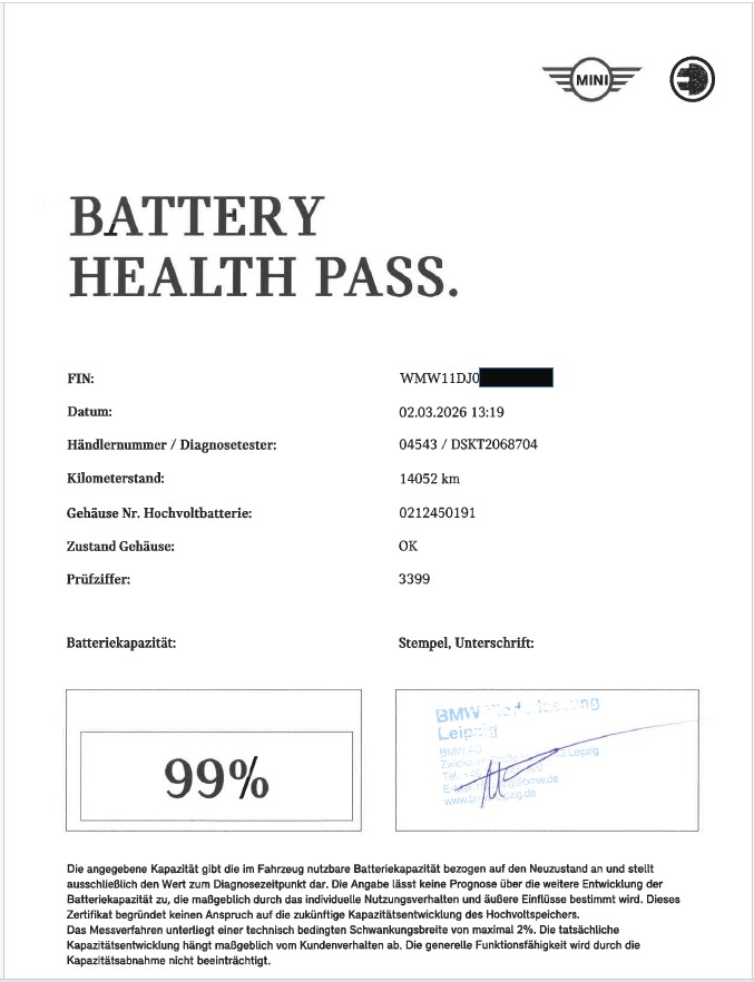 Das Fahrzeug ist lückenlos scheckheftgepflegt bei MINI/BMW. Im Februar 2026 wurde bei BMW ein frischer Service durchgeführt sowie der TÜV erneuert. Zusätzlich liegt ein aktuelles Batteriezertifikat mit einem Ergebnis von 99 % vor – ein klarer Beleg für den hervorragenden Zustand der Hochvoltbatterie.